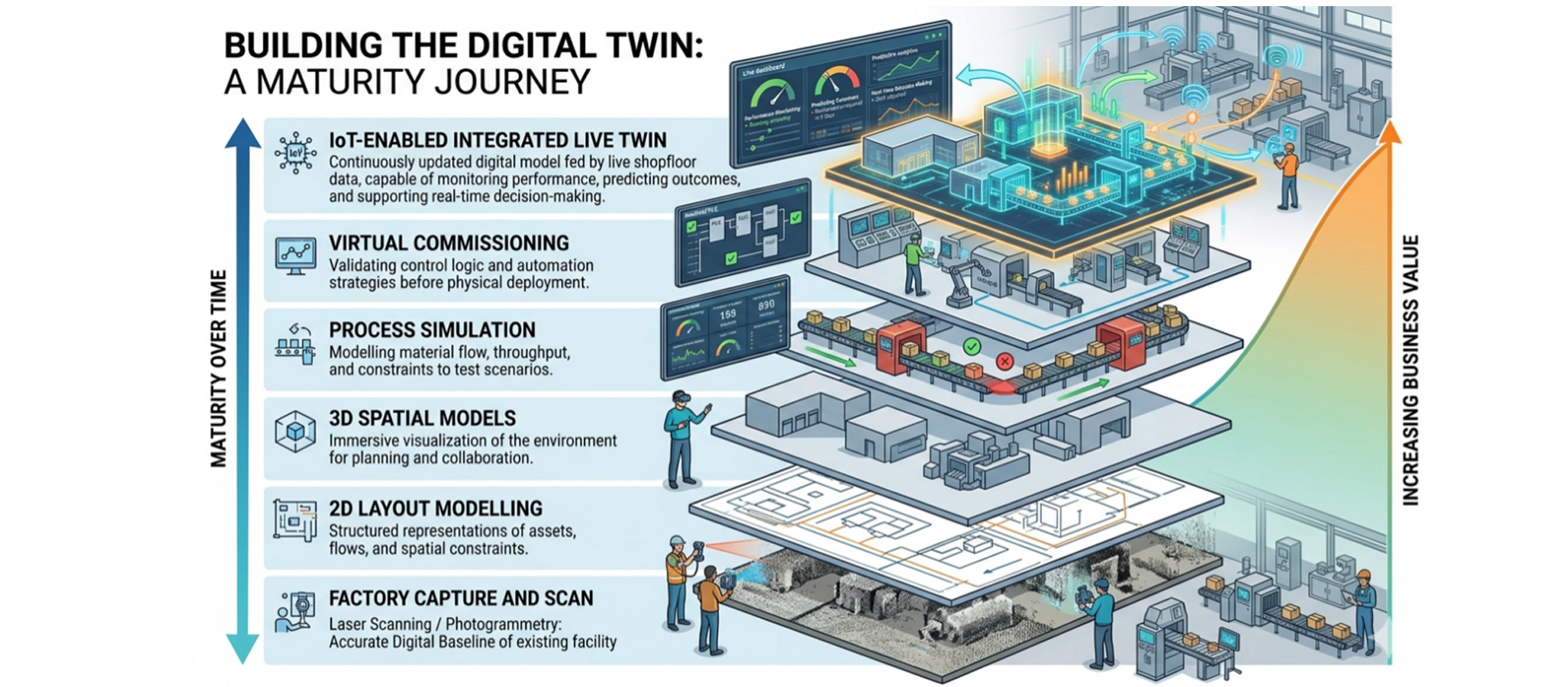 However, it’s important to recognise that digital twins are not binary — you don’t suddenly “have one” or “not have one.” Instead, they are built in layers that mature over time. A realistic journey often includes: